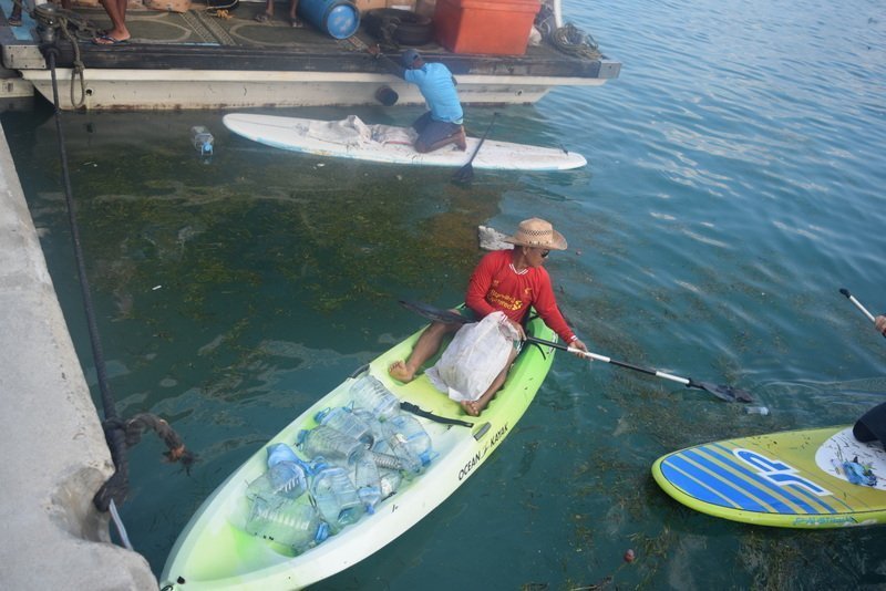 The event began at day break as we hit the water at 7:15am stocked up with high energy food, water and cameras. The conditions were extremely favourable with low wind, little swell and high cloud cover. The first quarter of our paddle took us against the current, so it was slow going but this allowed us to collect as much floating plastic as possible. We found the majority of marine litter in the corners of Himmafushi Harbour so we set about collecting as much as we could carry. Those working at the harbor watched us approach and a few men jumped into action and helped us collect plastic from the water. They gave us a few extra bags when we ran low. These positive reactions made our hard work feel extremely valuable.