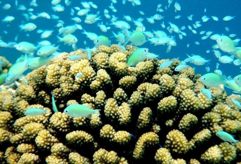 Corals are animals called polyps that share their home with algae called zooxanthellae. They work together in a symbiotic relationship which means both parties benefit. The coral animal produces a skeleton to shelter the algae whilst building the reef and the algae through photosynthesis provide the coral animal with 95% of its food. In the Maldives, the reefs are under severe external pressure. Sun screen is an added significant hazard which threatens the resiliency of the coral to climate change.