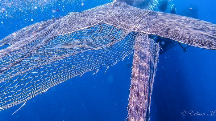 “بدا الأمر وكأن حوت الطفل كان ينبهنا إلى أن أمها كانت في ورطة ؛ بدأ الجميع على متن القارب بالصراخ “الحوت – الحيتان” … أمسكنا بمعداتنا للغوص الحر والكاميرات الخاصة بنا وقفزنا جميعًا في الماء ، بقيادة دليل الغوص المحلي. وبمجرد إقترابنا من الحيتان ، كان بوسعنا أن نرى المأساة التي كانت تحدث: فقد كان الحوت متشابكا في شبكة صيد ضخمة ، يبلغ طولها أكثر من ٥٠ مترا ، مليئة بالأسماك الميتة بما في ذلك سمكة قرش صغيرة. شعرت بالحزن والغضب عندما رأيت حوتًا أحدبًا ضخمًا يبلغ طوله ١٦ مترًا ، جنبًا إلى جنب مع صغيرتها التي تحوم حولها مغلوبة على أمرها! ”
