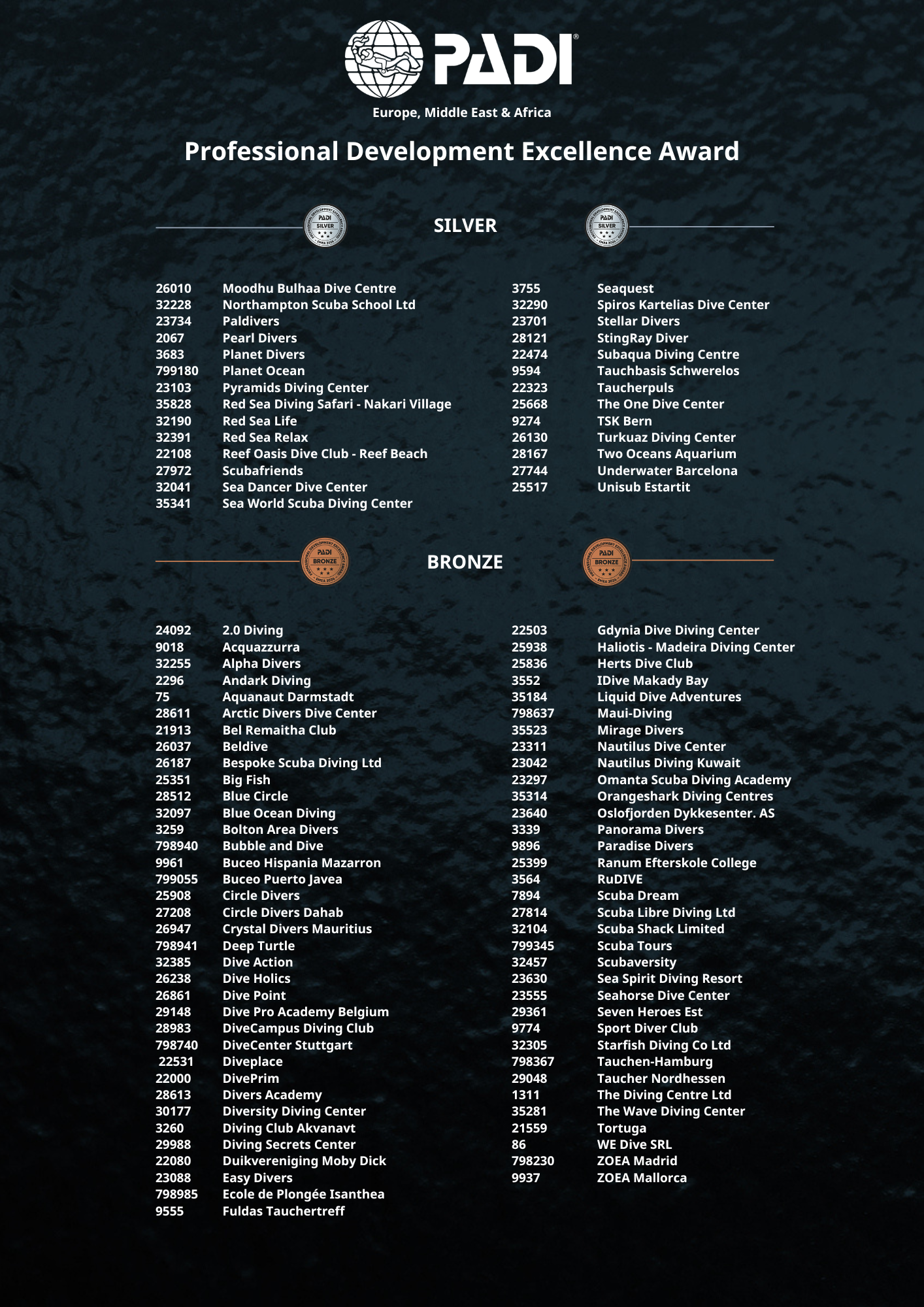 Die Zählung für den PADI EMEA Professional Development Excellence Award 2027 läuft und PADI EMEA Five Star IDC Stores mit aktueller Mitgliedschaft nehmen automatisch daran teil. Unternehmen, die 2026 die erforderliche Kursanzahl erreichen, erhalten ihren Award im ersten Quartal 2027.