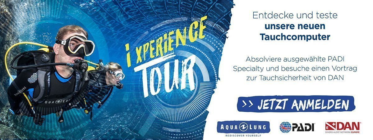 Aqua Lung, PADI und DAN laden Dich herzlich zur iXperience Tour ein. Das Event findet am 25./26.Mai 2018 in Nordhausen und am 08./09.Juni 2018 in Diez statt. Während der jeweils erste Tag dieser beiden Events ausschließlich für PADI Profis veranstaltet wird, ist der jeweils zweite Tag der Events öffentlich für alle Taucher. Entdecke die Aqua Lung Tauchcomputer und teste den i300C Tauchcomputer mit der neuen Bluetooth Smart Verbindung oder tauche mit dem Apeks Sidemount ab! Die Aqua Lung Mitarbeiter vor Ort stehen Dir gerne für alle Fragen zur Verfügung. Zudem besteht für PADI Mitglieder die Möglichkeit, die Instruktor Ratings für die PADI Specialties „Enriched Air Diver„ oder/und „Sidemount Diver„ vergünstigt oder sogar gratis zu erhalten. Du kannst außerdem einen spannenden Vortrag von DAN zum Thema Tauchsicherheit und Gesundheit besuchen oder an einer DAN Weiterbildung teilnehmen. Für einen reibungslosen Ablauf bitten wir dich, den oben stehenden Link zu nutzen und dich für das Event am Standort deiner Wahl anzumelden. Sobald du dich registriert hast, erhältst du weitere Informationen zu den einzelnen Angeboten und dem zeitlichen Rahmen deines Events.