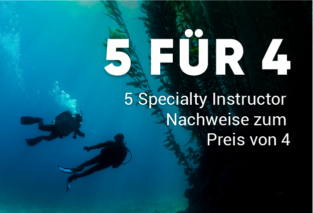 Wichtig: Dieses Angebot gilt nur für einen Specialty Instructor Antrag, der für alle fünf Specialty Instructor Ratings gleichzeitig gestellt wird. Des Weiteren gilt es nur, wenn du die Specialty Instructor Training Kurse bei einem PADI Course Director absolvierst. Es gilt nicht für direkte Specialty Instructor Anträge. Du kannst auch 10 Specialtys zum Preis von 8 oder 15 Specialtys zum Preis von 12 beantragen.