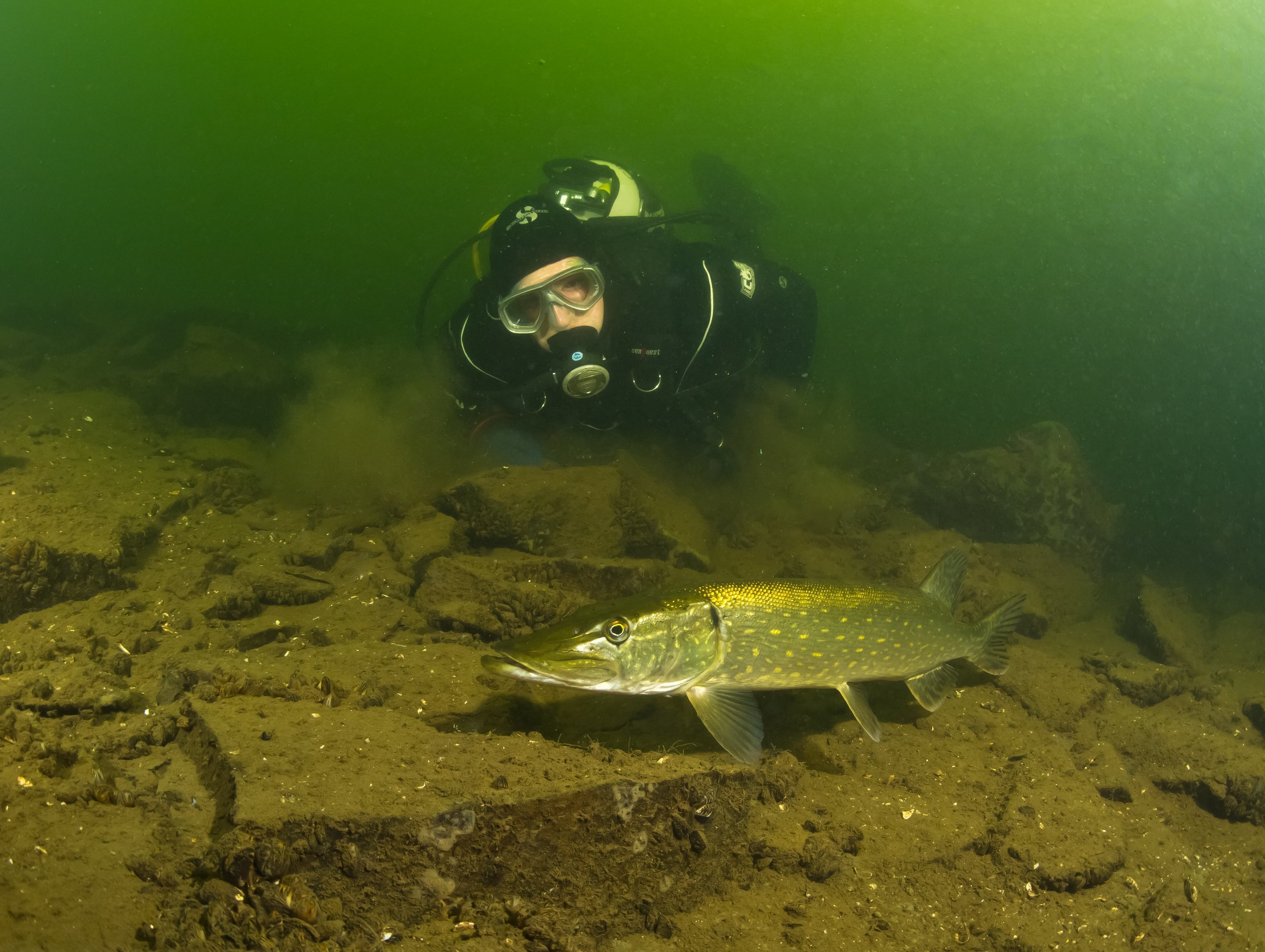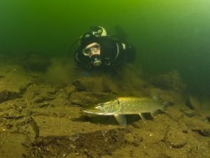 Künstlich angelegte Riffe, die frei schwebend im Wasser aufgehängt sind, bieten zahlreichen Fischen genügend Unterschlupfmöglichkeiten. Sie geben Halt für Schwämme, Muscheln, Moostierchen und Süßwasserpolypen. Wenn Du den Tauchgang richtig machst, tauchst Du durch Fischschwärme mit hunderten von kleinen Barschen, die an Glasfischschwärme in tropischen Meeren erinnern. Mit etwas Glück und natürlich viel einfacher mit Kenntnis vom Gewässer, kannst Du folgende Fische beobachten: Welse, Hechte, Karpfen, Zander, Barsche, Rotfedern, Plötze, Sonnenbarsche, Aale, Aalquappen, Schleie, Döbel und Karauschen. Auch Krebse sind in großer Zahl im Gewässer zu finden.