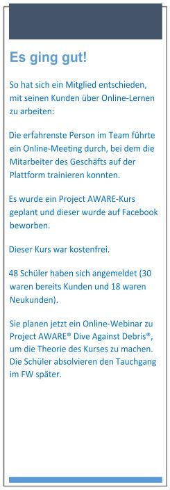 Du kannst die Knowledge Reviews für jeden Kurs online durchführen. Gehe beispielsweise während eines PADI Open Water, Advanced Open Water oder Rescue Diver Kurses über einen Video Chat auf Fragen zur Überprüfung fehlenden Wissens ein. Mache während des Kurses eine Frage-/Antwort-Sitzung, um zu sehen, wie es allen geht – bereite einige allgemeinen Fragen vor, die die Schüler stellen könnten. Verwende Videoclips, um eine Vorschau der Übungen im Wasser zu zeigen. Zeige Videos von deinen Tauchausflügen und Trainingstauchgängen, um den Schülern zu zeigen was sie im weiteren Verlauf des Kurses tun werden.