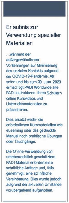 Equipment Specialist – Es ist am besten, wenn die Schüler das Equipment eLearning absolvieren, das gute Grundkenntnisse bietet. Führe dann online eine Überprüfung der Wiederholungsfragen durch und führe praktische Workshops mit den Schülern per Video-Chat durch. Lasse die Schüler deine Demonstrationen mit ihrer eigenen Ausrüstung verfolgen. Gebe Beispiele für die richtige Pflege der Ausrüstung, wie z.B. kleinere Reparaturen an Neoprenanzügen durchgeführt werden, wie ein Ersatzteilset zusammengestellt wird usw. Binde die Schüler mit ein und bewerte ihren Fortschritt. Verwende das Equipment eLearning als Tool, um Videoclips zur Funktionsweise eines Lungenautomaten usw. zu zeigen.