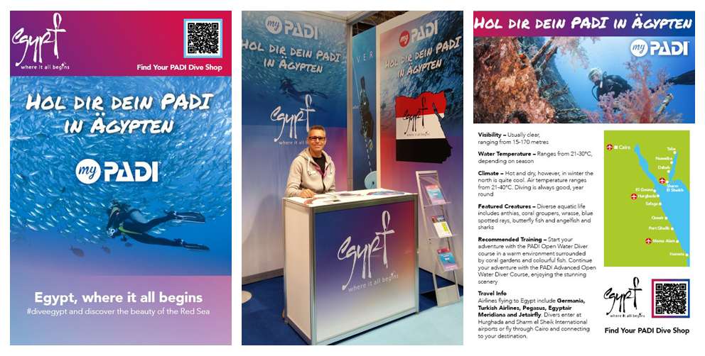 Dedicated flyers – in English and German – were handed out with info about Egypt, a map highlighting the different diving destinations, the closest airports and a QR code with a link to the PADI Dive Shop Locator …in order to help visitors to find their favorite PADI Dive Resort in Egypt!