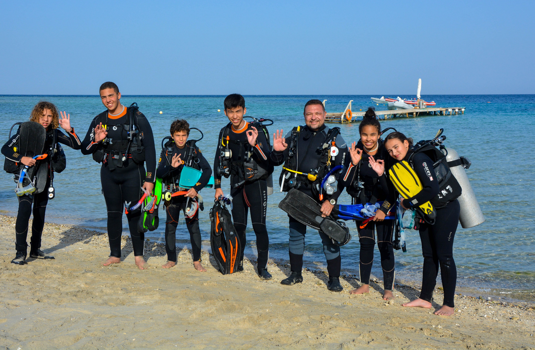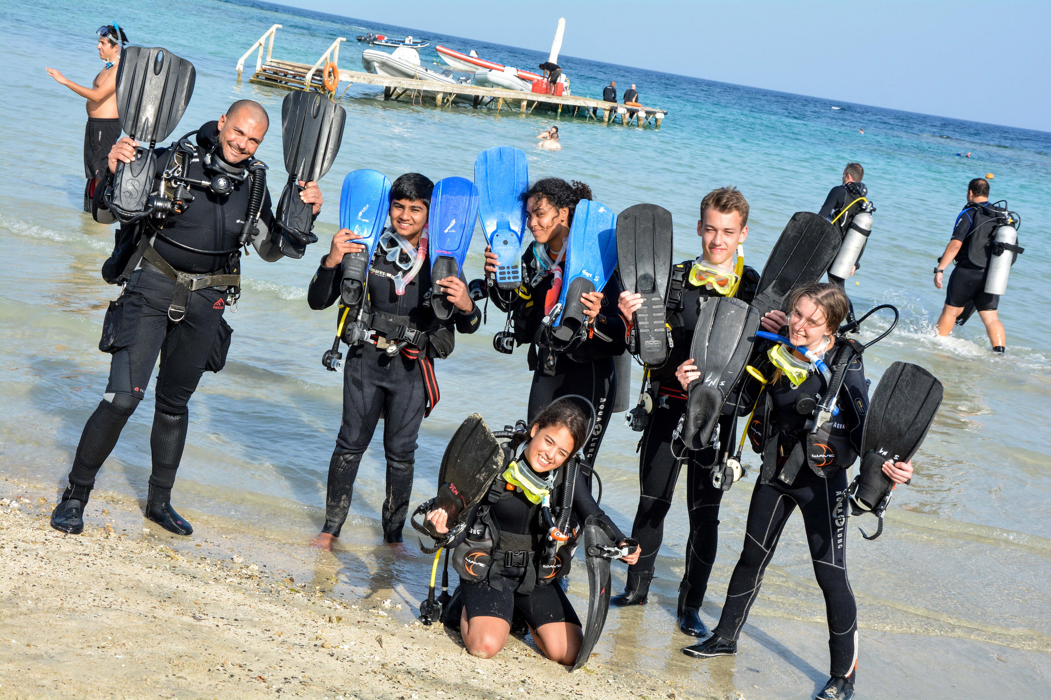 Groups were coordinated to carry out different parts of the course to make sure each group had space to learn and do activities in an unrushed, constructive but fun learning environment. For the confined water activities, the different groups were divided between the local swimming pool and Marsa Shagra’s shallow sandy-bottomed bay, which is ideal for training.