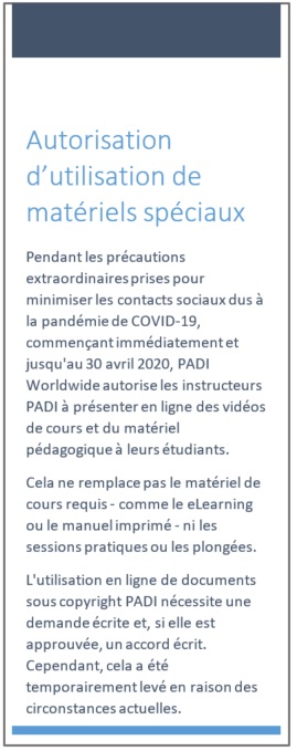 En utilisant le matériel PADI existant et la visioconférence, vous pouvez faire une grande partie (ou la totalité) des cours que vous feriez normalement au centre de plongée. Vous pouvez même leur faire « visiter » le centre de plongée et leur montrer de quoi vous parlez : les différents types de matériels, comment entretenir une combinaison de plongée, etc. Vous pouvez aussi montrer des photos de vos dernières plongées pour donner l’envie d’aller plonger. Vous pouvez faire tout cela à partir de vos appareils – smartphone, tablette ou ordinateur portable. Vous pouvez aussi encourager les discussions en ligne entre vos élèves pour créer des liens amicaux et des binômes. Les possibilités sont infinies…