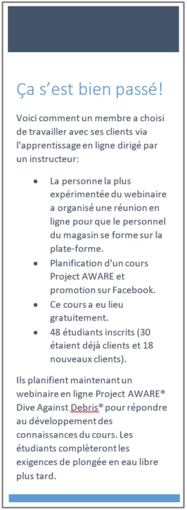 Vous pouvez faire la révision connaissances pour n’importe quel cours en ligne. Par exemple, pendant un cours PADI Open Water, Advanced Open Water ou Rescue Diver, passez en revue les réponses fausses des révisions des connaissances via un chat vidéo. Organisez une session de questions / réponses à mi-parcours pour voir où en sont vos élèves, préparez-la avec quelques questions courantes que les élèves posent. Utilisez des clips vidéo pour montrer les sessions dans l’eau. Montrez des vidéos de vos voyages de plongée et de vos plongées de formation pour susciter l’enthousiasme à propos de ce qu’ils feront plus tard dans le cours.