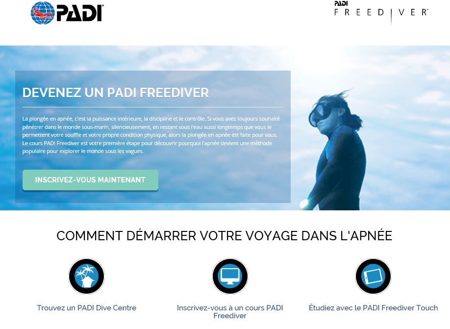 PADI a le plaisir de publier ses projets promotionnels pour le programme Freediving dans le territoire EMEA. PADI EMEA a développé une série de stratégies de marketing dans tout notre territoire pour inspirer et convaincre les apnéistes potentiels.
