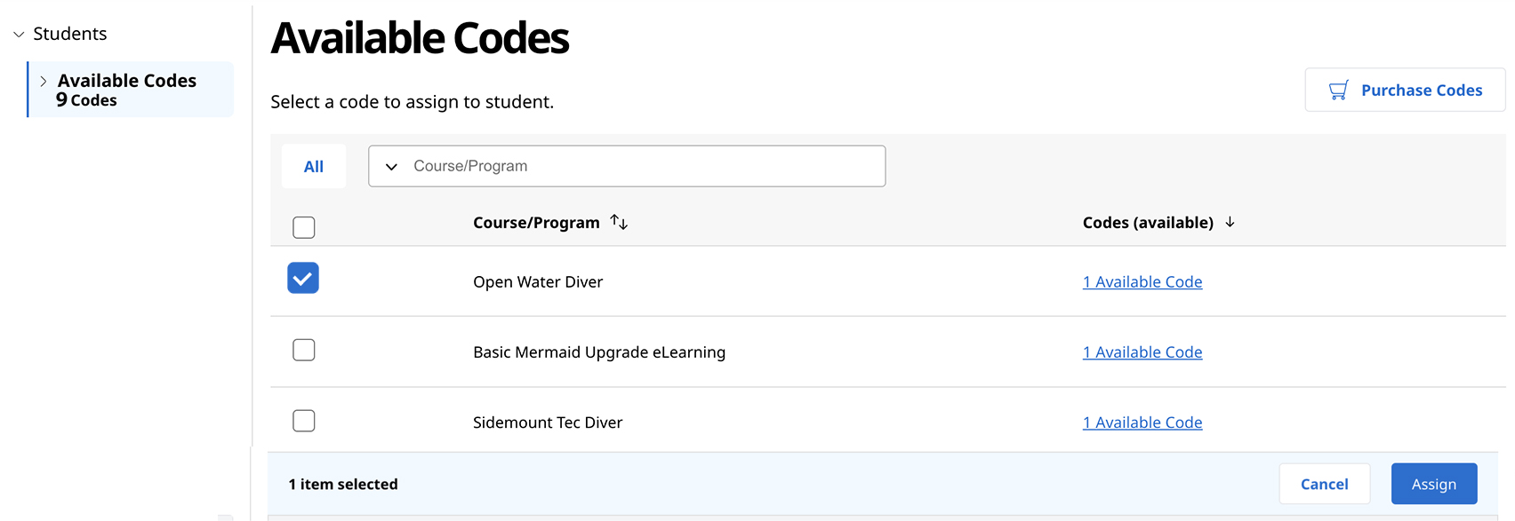 Vous pouvez attribuer des codes à partir d’ici en cochant le cours/programme que vous voulez attribuer, puis en cliquant sur le bouton « Assign » en bas à droite. Vous pouvez aussi attribuer des codes à partir de la liste des élèves en sélectionnant la « Detail View » d’un individu, puis en choisissant « Assign Codes. »