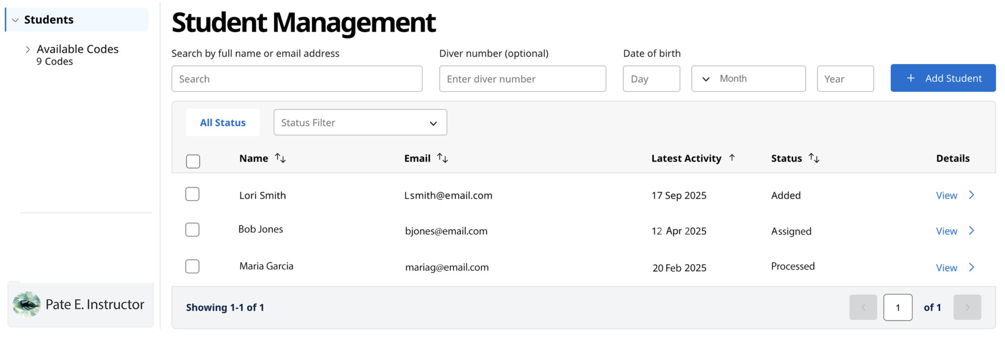 Sur la vue « Student Roster », vous verrez le nom, l’email, la dernière activité et le statut de chaque élève plongeur, ainsi qu’un lien permettant d’afficher plus de détails sur la personne. Vous pouvez trier chaque colonne par ordre croissant/décroissant, et vous pouvez aussi utiliser le menu déroulant « Status Filter » pour trier par statut. Par exemple, vous pouvez rechercher tous les élèves plongeurs que vous avez récemment ajoutés à votre fichier.