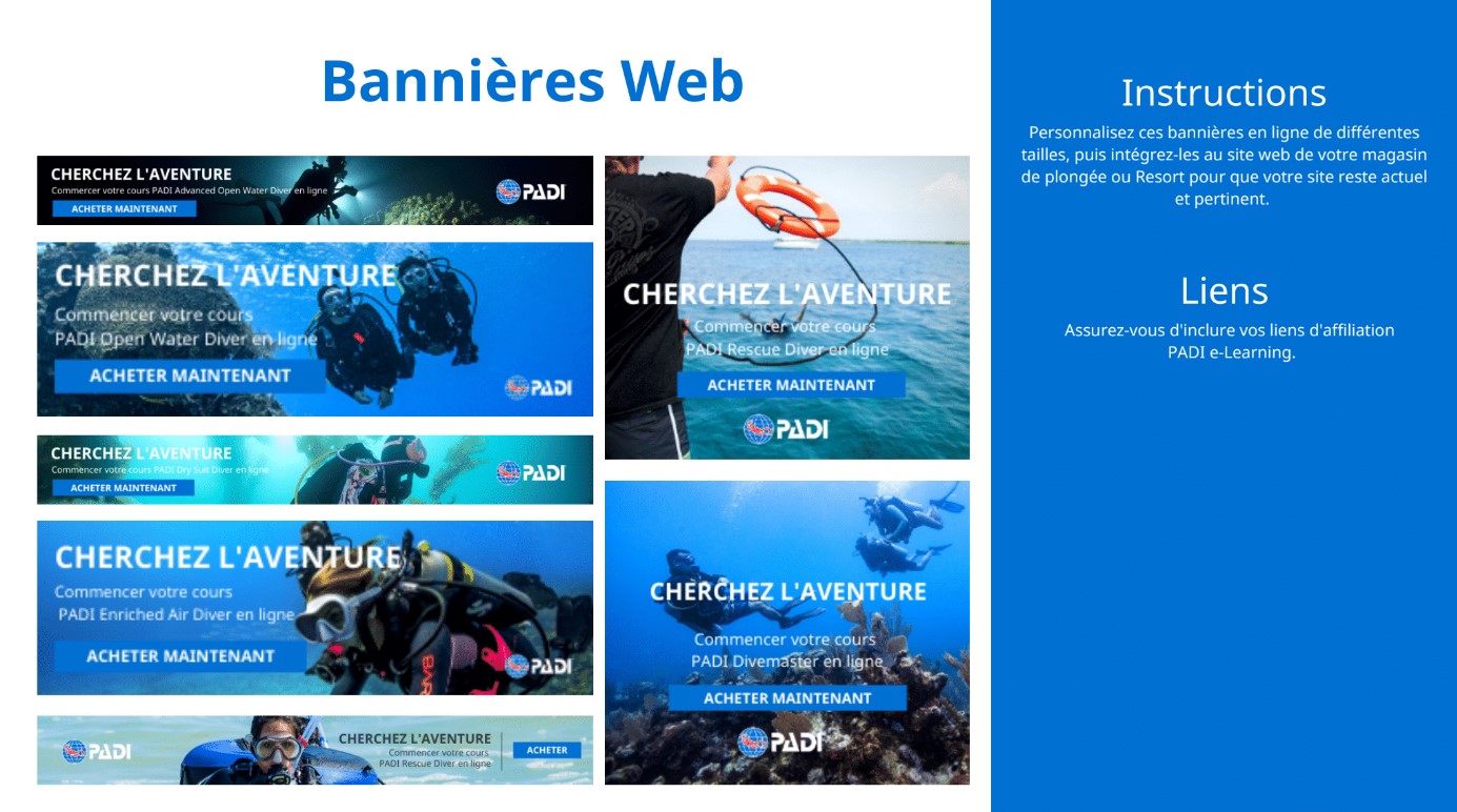 • Des outils promotionnels PADI eLearning, tels que des messages et des histoires sur les réseaux sociaux, des bannières web, des images d’en-tête d’e-mail et des modèles d’e-mails. Tous ces éléments sont entièrement personnalisables pour votre magasin de plongée.