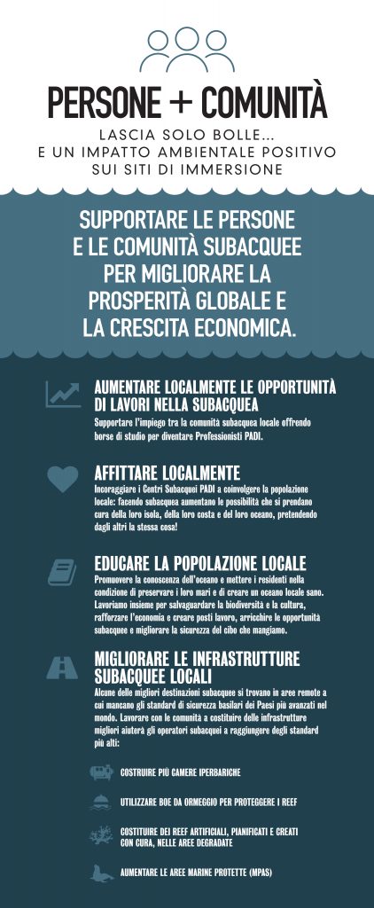 PERSONE E COMUNITÀ: Fai di più per aiutare a costruire infrastrutture subacquee e supportare la formazione degli abitanti locali perché siano promotori della tutela. Educa e supporta le comunità locali perché sviluppino il giusto atteggiamento mentale nei confronti del concetto di protezione necessario per il benessere dell’oceano e per la tutela delle creature marine.