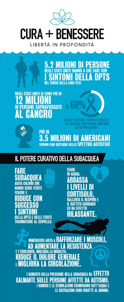 SALUTE E BENESSERE: Così come aiutiamo il mondo a guarire esternamente, allo stesso modo dobbiamo farlo anche internamente. Grazie alla subacquea, molte persone hanno trovato speranza per il loro futuro. Storie di vittorie sulle avversità, sulle malattie e sulle difficoltà testimoniano il potere curativo della subacquea. Condividi incredibili storie di trasformazione personale così che altri ne possano beneficiare.