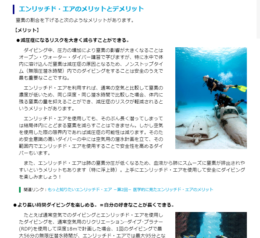 今回のブログは、PADIプロメンバーの皆さんにこのウェブページリニューアルを機に、より安全性の高いダイバーを増やすエンリッチド・エアSPのメリットをダイバーに広めていただきたいと思います。