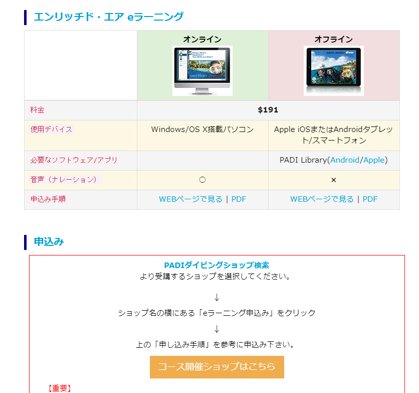 このように、このウェブページからeラーニングの申込が出来ますので、お客様にご案内していただき、お店ではエンリッチド・エア「実際への応用」を2回行うだけで認定することができます。もちろん、オプションとして実際の海で海洋実習を行うこともできます。