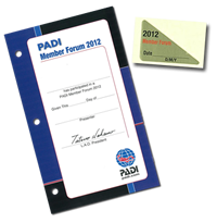 「PADIメンバー・フォーラム2012」のすべての項目を終了すると、アドベンチャーログサイズの証書と、Cカードに貼ることができるシールが送られます(右写真)。また、MI(マスター・インストラクター)を目指す際の3回の「インストラクター開発セミナー」の1回分のクレジットになる等のメリットもあります。