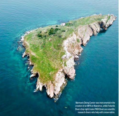 Marmaris Diving CenterはNeandrosのMPA(保護区)創設に貢献し、Fiskardo Divers(右上)はPADIダイバーを科学調査ダイバーとして養成し、保護に貢献している。