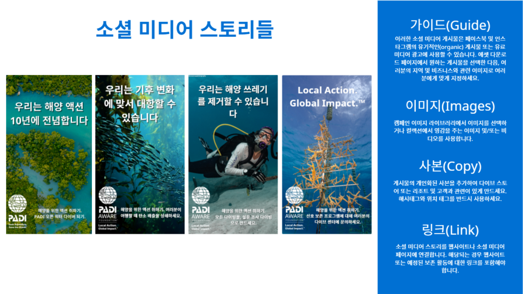 우리는 아름다운 프로모션 에셋과 시장 보존 활동을 만들 시간을 만들 시간을 할애하는 것이 때때로 어려울 수 있다는 것을 이해하고 있기 때문에, 우리는 여러분을 위해 완전히 새로운 PADI 미션 허브 마케팅 툴킷으로 쉽게 시작할 수 있도록 만들었습니다! 이러한 디지털 에셋을 활용하는 것으로써, 여러분의 지역 보존 활동이 글로벌 영향을 미칠 수 있습니다.
