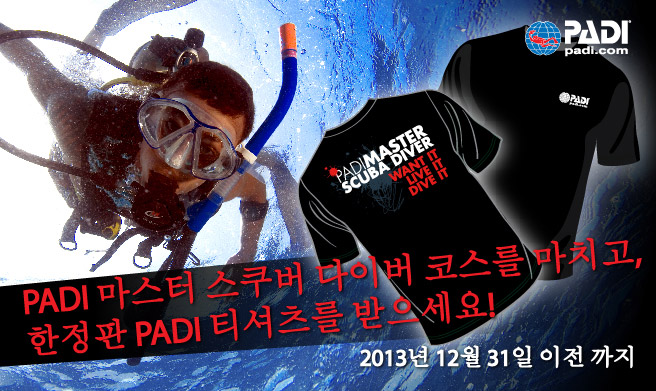 2013년 PADI 마스터 스쿠버 다이버에 도전할 조건을 갖추셨나요? PADI 마스터 스쿠버 다이버 코스를 마치고, 스페셜 에디션 PADI마스터 스쿠버 다이버 티셔츠를 받으세요! 오픈워터 다이버 + 어드벤스드 오픈 워터 다이버 + 레스큐 다이버 + 5 PADI 스페셜티 다이버 자격증 + 50회 다이빙 로그 = PADI 마스터 스쿠버 다이버 2013년 12월 31일 이전 까지