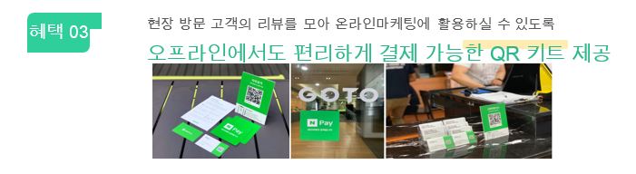 혜택3. 온라인 마케팅에 활용 및 오프라인에서도 어디서나 편리하게 결제 가능한 네이버 페이 QR 키트를 제공해드립니다.