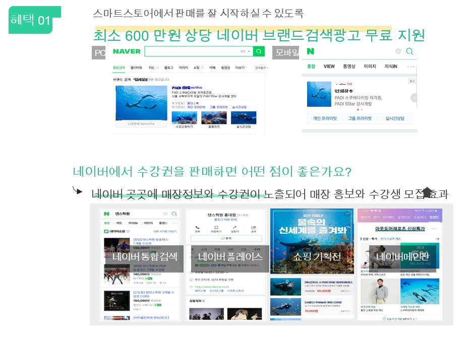 네이버에서 무료로 스마트스토어를 개설하신 후 스쿠버다이빙 강습을 판매하시는 PADI 다이브 샵 멤버분들께 최대 600만 원 상당의 네이버 브랜드 검색 광고를 지원해드립니다!
