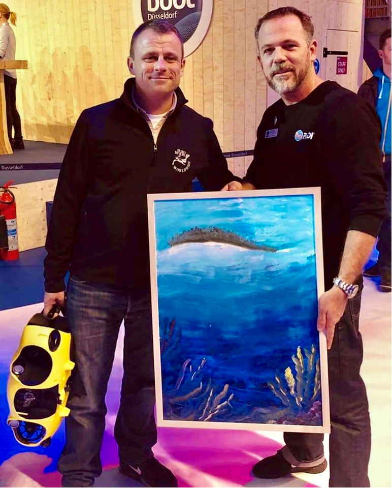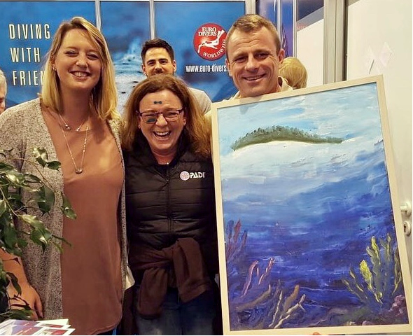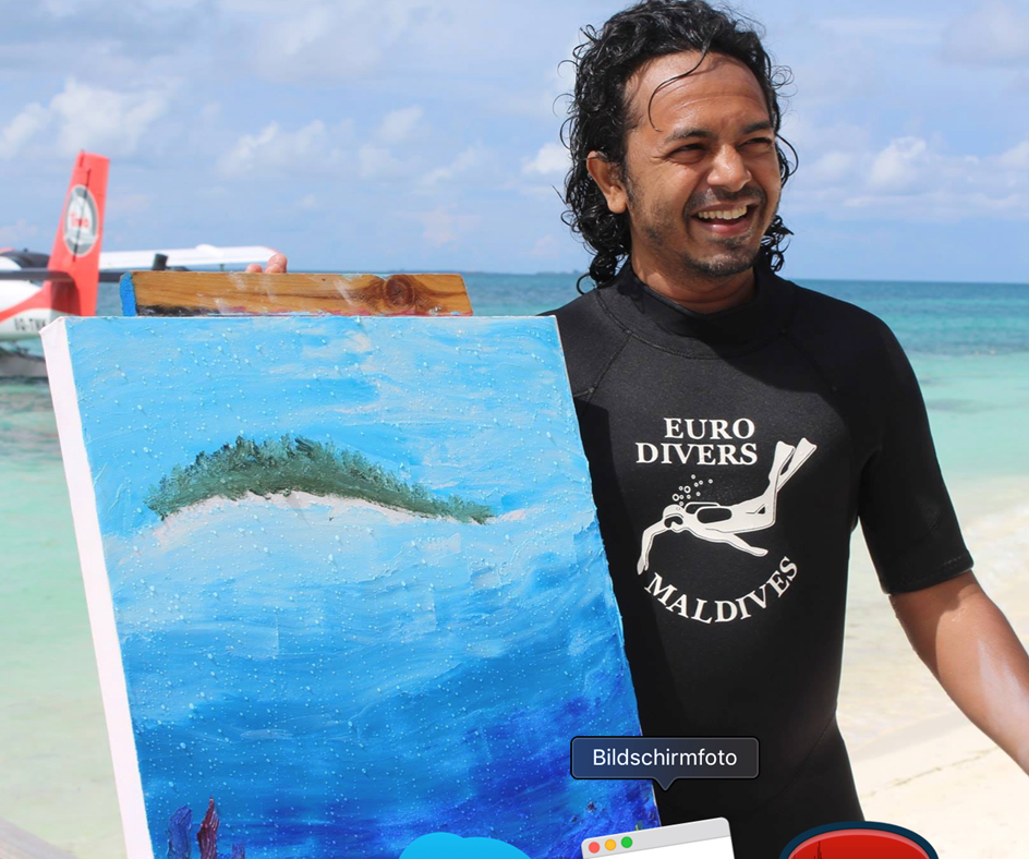 During the resent BOOT show in Düsseldorf, Euro-Divers Worldwide together with PADI had the privilege to raffle a piece of art painted underwater by a Maldivian artist named Ihfal Ahmed.