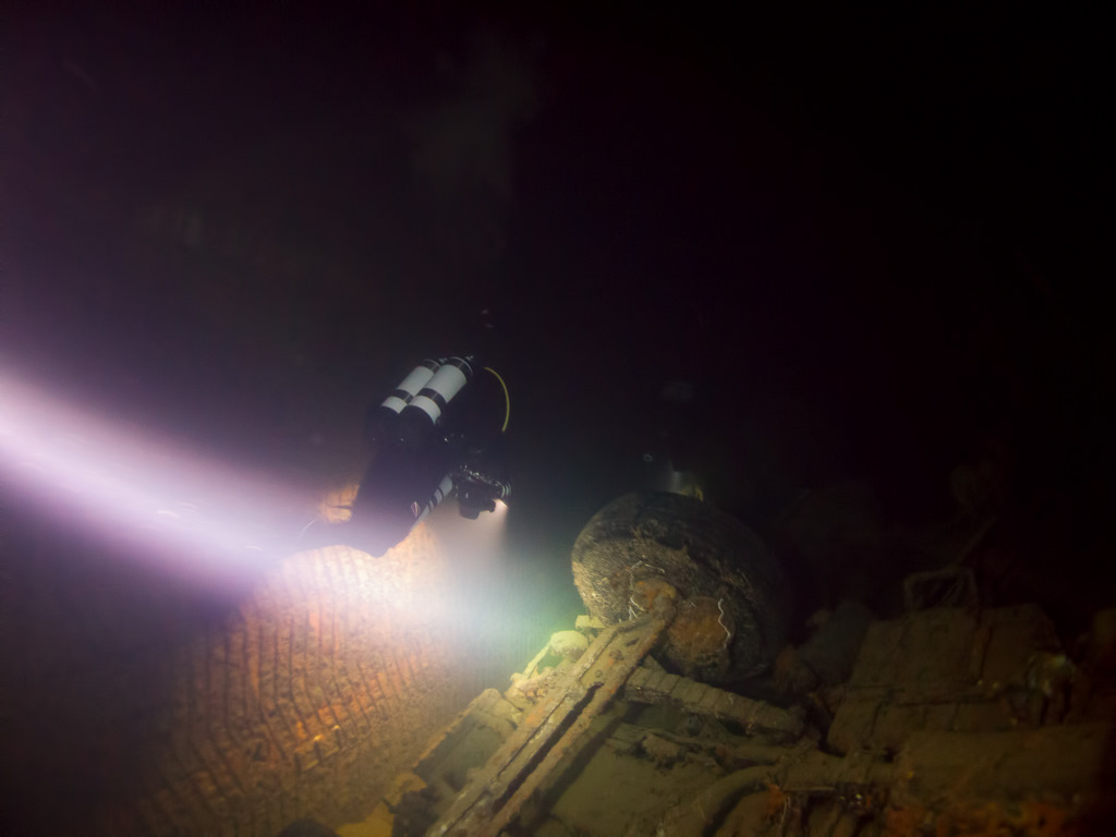 The 24 meters of width become the divers’ paradise. With 4 cargo decks and the promise that no salvage has taken place, this wreck would take over 100 dives to see everything. She was carrying 104 18-wheeler trucks when she went down (and one blue car – the captain’s little blue Lada) which were all shackled in place.
