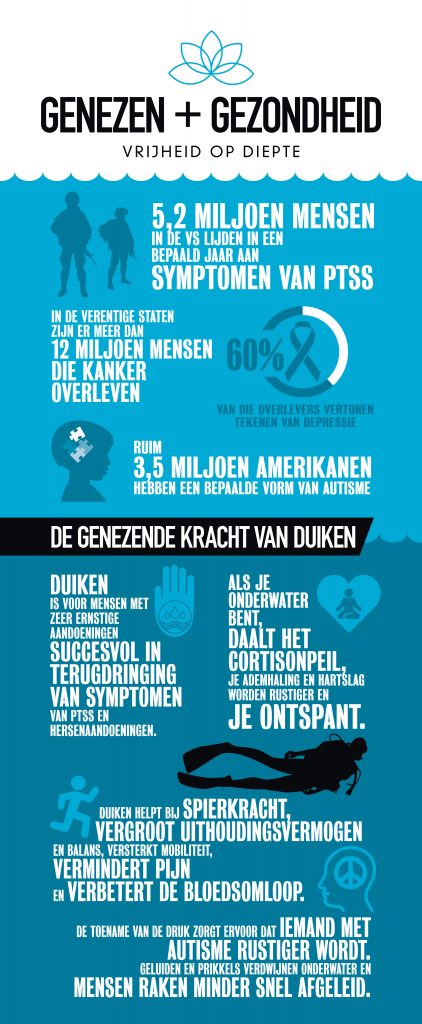 GEZONDHEID EN WELZIJN: Als we de wereld van buiten af helpen genezen, genezen we deze ook van binnen uit. Veel mensen putten hoop voor hun toekomst uit duiken. Verhalen over overwinningen op tegenspoed, ziekte en lijden, getuigen van de genezingskracht die van duiken uitgaat. Deel de wonderbaarlijke verhalen over persoonlijke transformatie met anderen zodat zij er baat bij hebben.