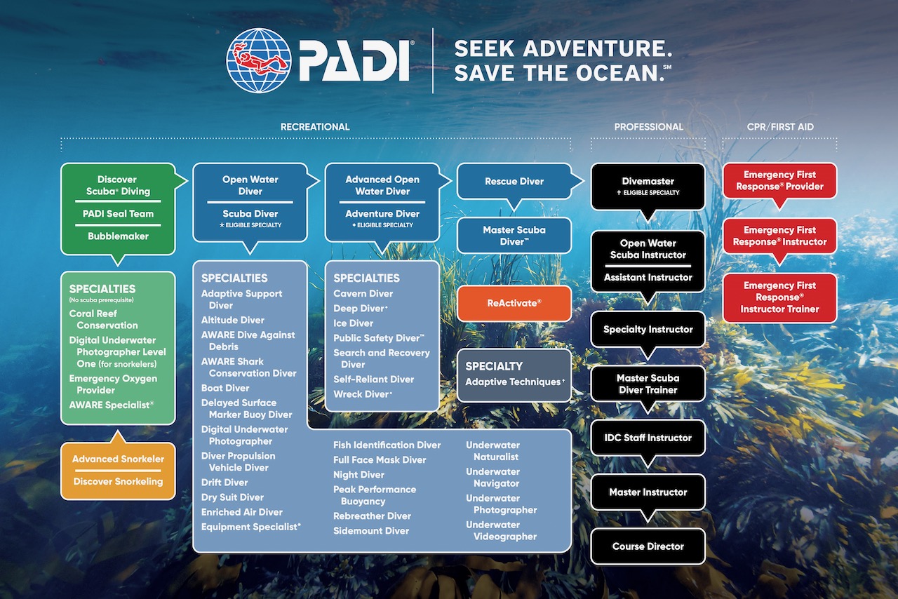 The power of the PADI system of diver education is its diversity in courses. From entry level all the way up to the professional levels: