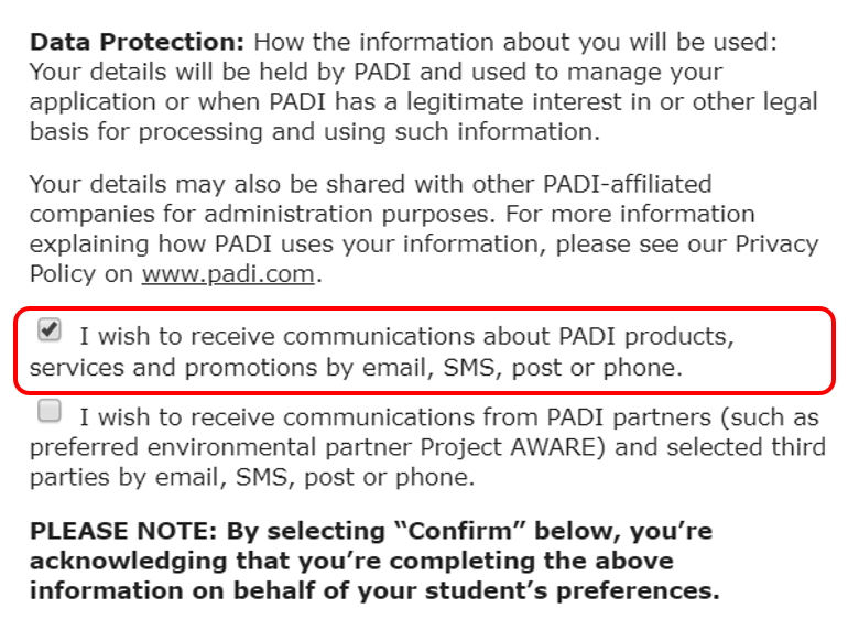 Należy pamiętać o jeszcze jednej kwestii. Kiedy przetwarzasz dane uczestników w PADI Online Processing Centre, upewnij się, że zaznaczyli oni pole obok tekstu w ramce, co oznacza, że wyrazili zgodę na otrzymywanie informacji od PADI. Dzięki temu otwierasz drzwi dla marketingu PADI, który ma pomóc Twojej firmie odnieść sukces. Po zaznaczeniu tego pola uczestnicy programu Discover Scuba Diving dostaną kilka e-maili przeznaczonych specjalnie dla nich, z których dowiedzą się, jak zrobić kolejny krok i dlaczego powinni wrócić do Ciebie, aby ukończyć kurs PADI Open Water Diver i zdobyć certyfikat nurkowy.