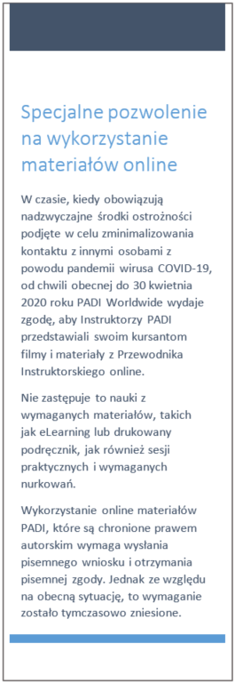 Jeśli Twoi kursanci nie mogą przyjść do Ciebie, wykorzystaj technologię, aby przyjść do nich! Podczas nauki z instruktorem online przekazujesz wiedzę w ten sam sposób, jak dotychczas, ale zamiast spotykać się z kursantami osobiście wykorzystujesz wideokonferencję. Pomyśl, jak rozmawiasz z przyjaciółmi i członkami rodziny używając Facetime, Skype lub czatów Google, a następnie zrób to samo, aby omawiać z kursantami Sprawdziany wiedzy lub przeprowadzić zajęcia praktyczne „na lądzie” podczas kursów PADI®. Bądź kreatywny!