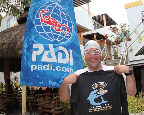 A love of eating pies and protecting sharks has inspired one scuba diver to make a pledge he may regret! If his fundraising target is met he’ll swim 1,500 metres. But for every $10 over the target PADI Master Instructor, Andrew Barrett will swim an extra 100 metres.  This puts Andrew’s Finathon™ challenge firmly in the hands of his friends. The more dollars people donate the more he’ll have to swim so please give generously to protect sharks.