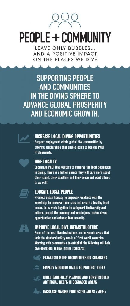 PEOPLE AND COMMUNITY: Do more to help build dive infrastructure and support training local people to foster sustainability. Educate and support local communities to cultivate the protection mindset necessary for ocean health and marine animal protection.