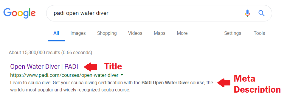 #1 Page URL – Your learn to dive page should include the words “open water,” “scuba diving certification,” (or equivalents for native speakers in your area). If your website domain includes the word “scuba,” “plongée,” “buceo,” all the better.