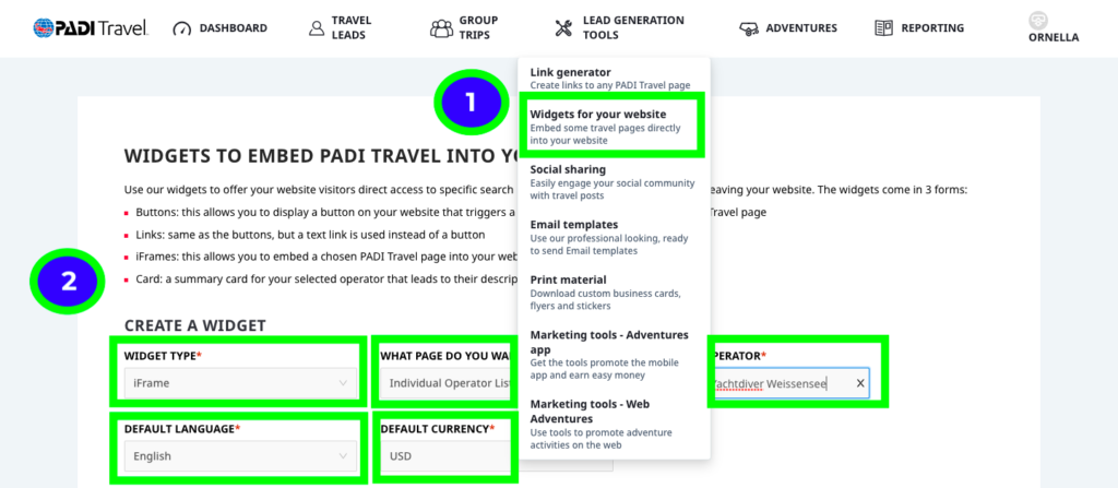 - 使用您的 PADI SSO 登錄外聯網,從下拉菜單中選擇小工具選項,然後按照步驟說明進行操作。 PADI 外聯網也可通過專業人士網站訪問。