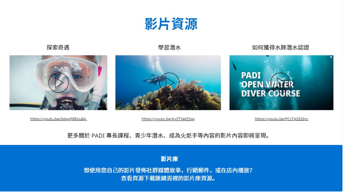 - 潛水員獲客行銷資源,包括社群媒體發佈內容及故事,電子郵件橫幅和模板,網頁橫幅和模板,還有一系列影片資源