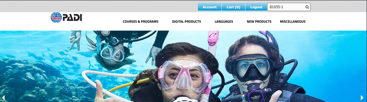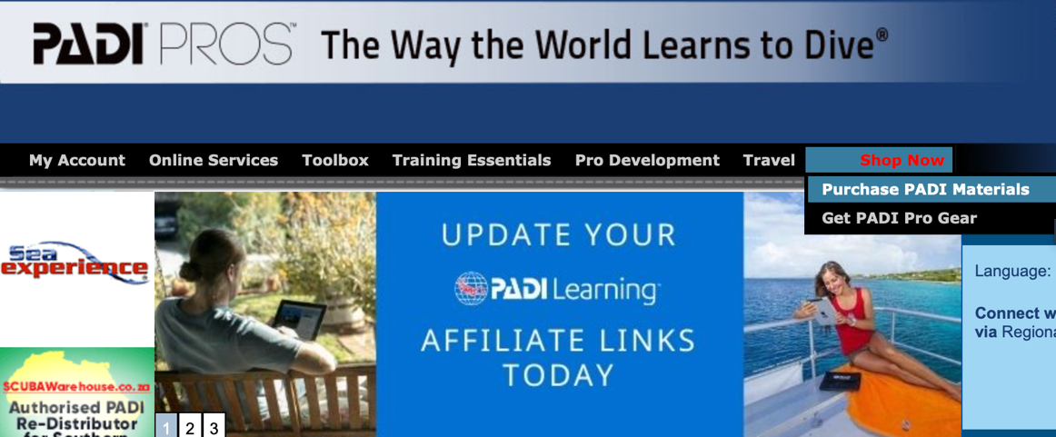 1:在Pros Site頁面右上角的“Shop Now”中,選擇”Purchase PADI Materials”,