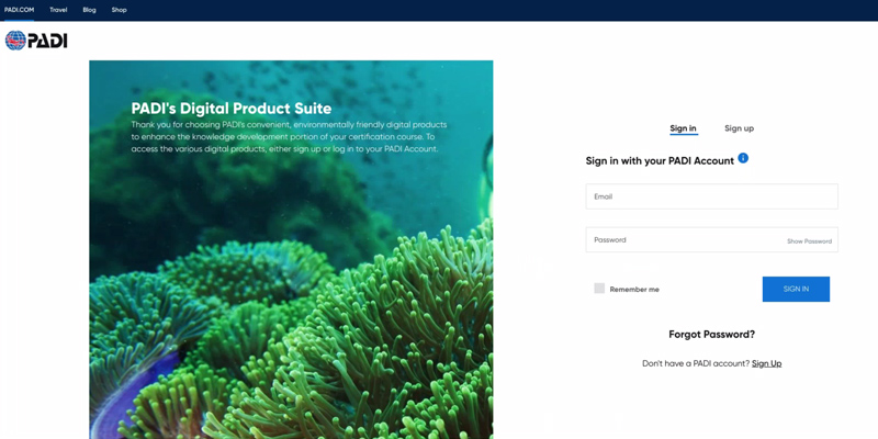 當用戶登錄後,他們可以選擇確認或修改他們的地址。現在,頁面左上角的圖示從PADI變成了PADI eLearning®,用戶在使用過程中可以確認自己身處在所擁有課程的電子線上學習環境中(我的課程的小標題可以幫助確認這點)。在一個簡單乾淨的版面上,每個課程都被清晰地標示在上面。使用者可以點擊該面板上的圖片或點擊“查看課程”去訪問他們的證書中的所有內容。所有這些內容都被清晰的列出且可以無縫訪問,並提供了具有良好用戶體驗的連結,最大的進步之一就是現在可以一鍵登錄並訪問電子線上學習環境。